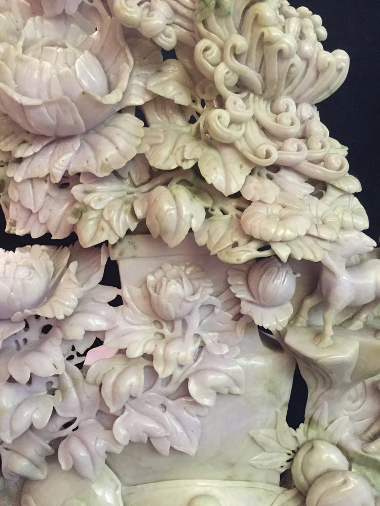 The lapidary has expertly chiseled this floral with openwork from a single boulder. Rising from a ruyi sceptre at base intricately carved foliage entwine a Hu shape vase with pomegranate prunus and three elevates rams.