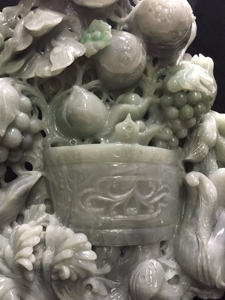 The lapidary has expertly chiseled this single boulder all around with bronze from vase of relief design bountifully surrounded by bars of gold peaches, grapes, pomegranate and amber tone bat.