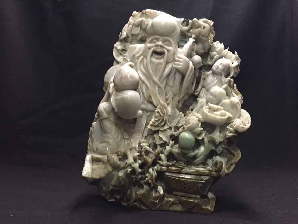 Shouxin statue, sculpt in transparent to opaque, green mottled jadeite.