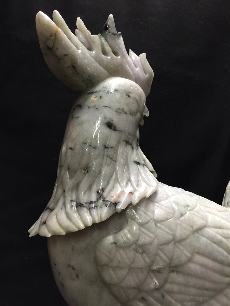The lapidary has expertly shaped this pair all around from a single boulder. Rising from a rocky perch and flourishing foliage are twin roosters with intricately carved tail feathers and etched wings in relief.